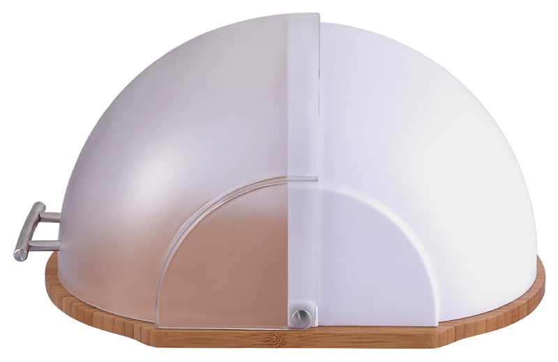 - Een stijlvolle broodbox van kunststof met bamboe bodem.