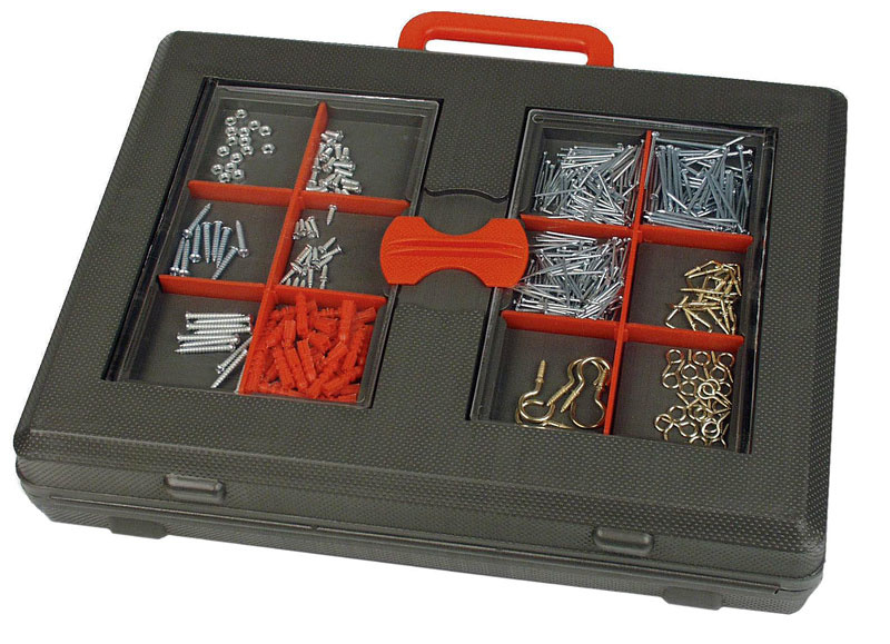 - box met assortiment kleinijzerwaren (spijkers, schroeven, kabelschoentjes, pluggen, haken).